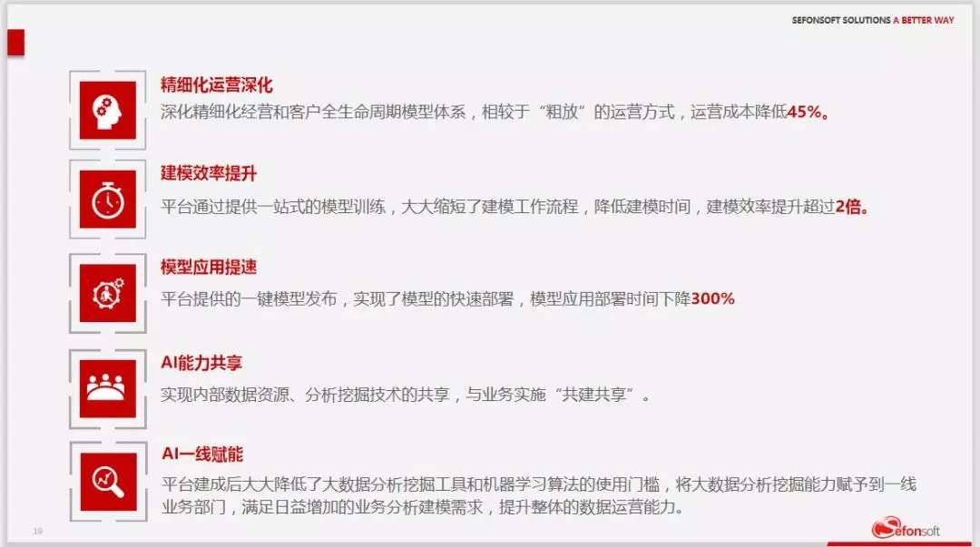 平臺提供100余種分析算法,并提供自定義算法能力,滿足各類業務場景;建模過程無需編程,采用拖拽算子的可視化操作方式即可完成海量數據的價值挖掘;以可視化的方式對模型訓練進行評估和對比,方便業務人員更快確定最佳預測模型,提供高可信度的答案。